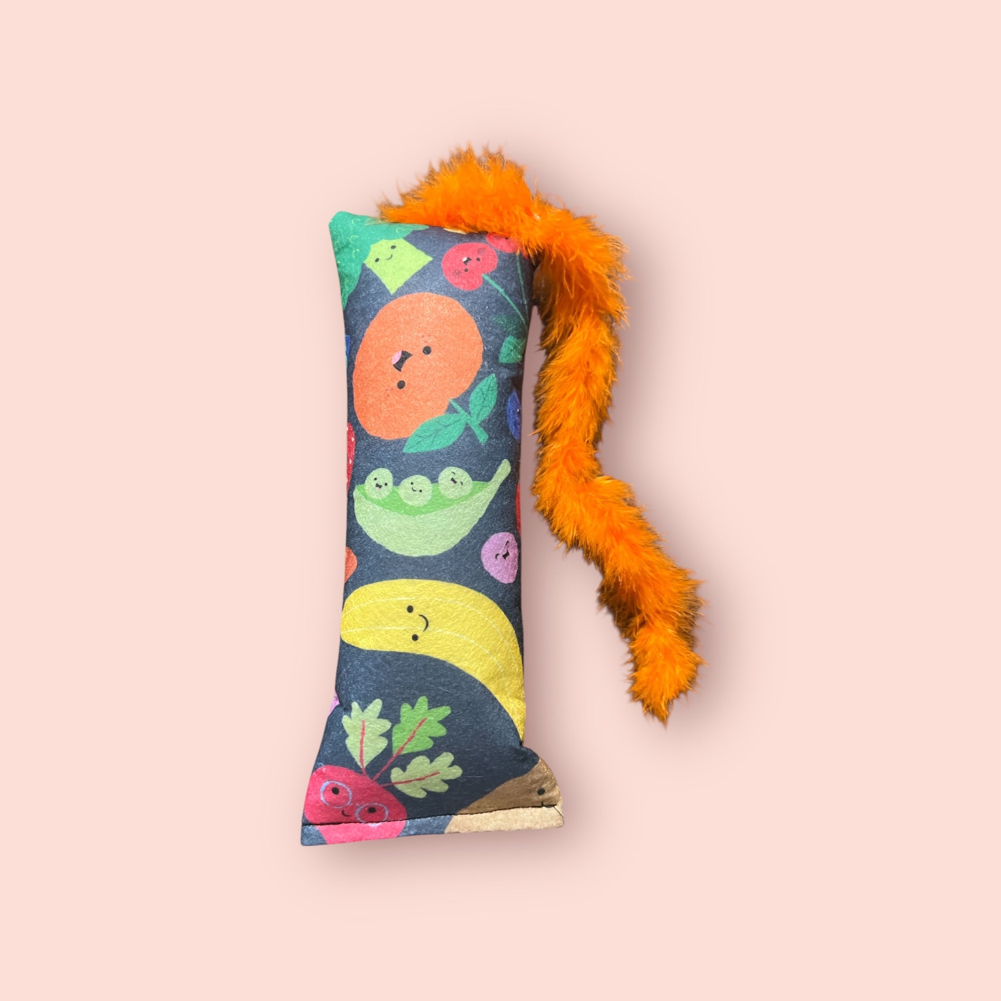 Experience endless fun with the Jingling Kitty Kicker. Each kick releases the enticing aroma of catnip, keeping your feline friend entertained. With its fun fruits and veggies print, this kicker is not just a toy, but a delightful addition to your cat's playtime.